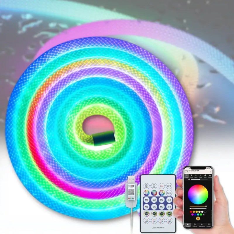 Неонова LED RGB стрічка 5 м із лускатим покриттям і керуванням через застосунок Гнучка неонова LED-стрічка з унікальною лускатою поверхнею завдовжки 5 метрів призначена для декоративного підсвічування інтер'єрів, вітрин, заходів та автомобілів. Працює від USB, не вимагає складного під'єднання, стійка до зовнішніх впливів (IP67), безпечна та зручна у використанні. Завдяки гнучкості й особливій структурі, стрічка легко приймає будь-яку форму — від вигнутих ліній до контурів літер і фігур. LED-стрічка підтримує два варіанти керування — через пульт і мобільний застосунок. Вбудований музичний режим дає змогу синхронізувати підсвітку з ритмом звуку: вона мерехтітиме в такт музиці, створюючи ефектну атмосферу. Не має липкої основи, що зручно для тимчасового встановлення без слідів на поверхні.
